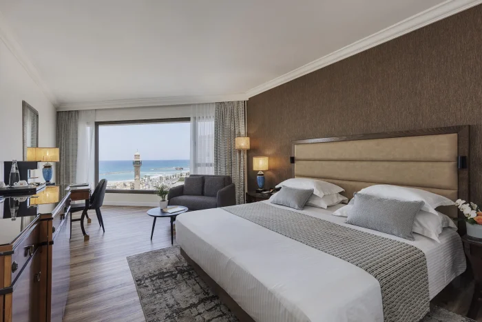 The Hotel’s Classic rooms offer a delightful retreat in Tel Aviv with their airy spaciousness, luxurious amenities, and elegant color scheme. Enjoy the serene ambiance while watching the beautiful view of the Mediterranean through the expansive windows.